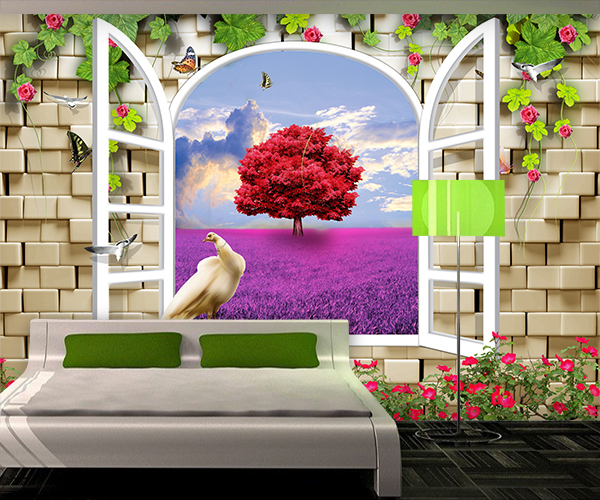 Фотообои Окно с видом на пейзаж и птиц павлина